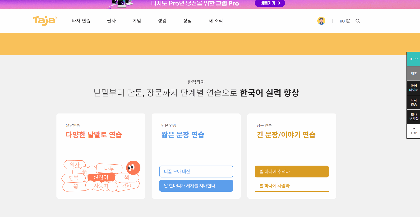 해당 화면에서 토픽에서 제공하는 자리,낱말,단문,장문 등을 연습할 수 있습니다.